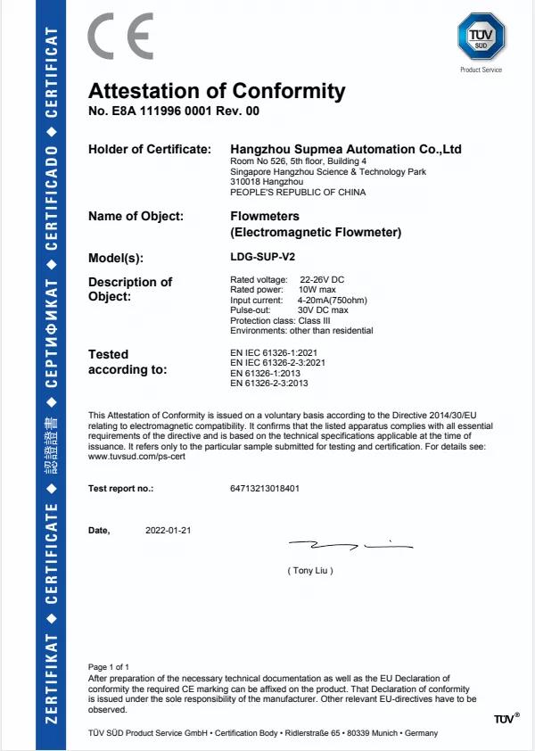 近日,美儀核心產(chǎn)品電磁流量計(jì)榮獲國(guó)際頂級(jí)檢測(cè)機(jī)構(gòu)TüV南德意志集團(tuán)頒發(fā)的CE認(rèn)證證書(shū)。
